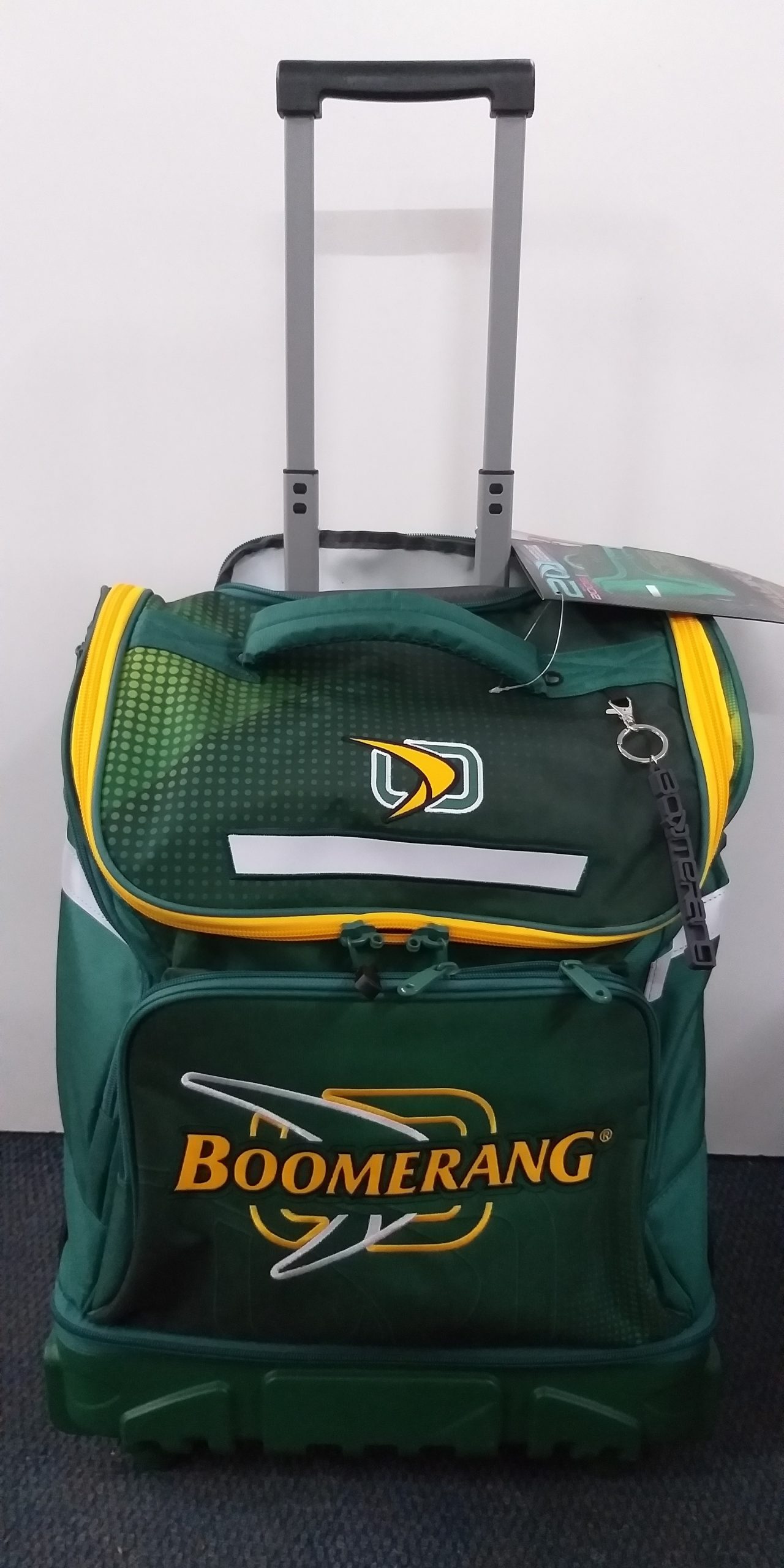 Boomerang Big Wheel Hard Base Green and Gold XL Dimensions : 38 x 23 x 58cm Big Wheels and a solid bottom With back straps Quality Zippers and Toggles 4 Fabric side  pockets