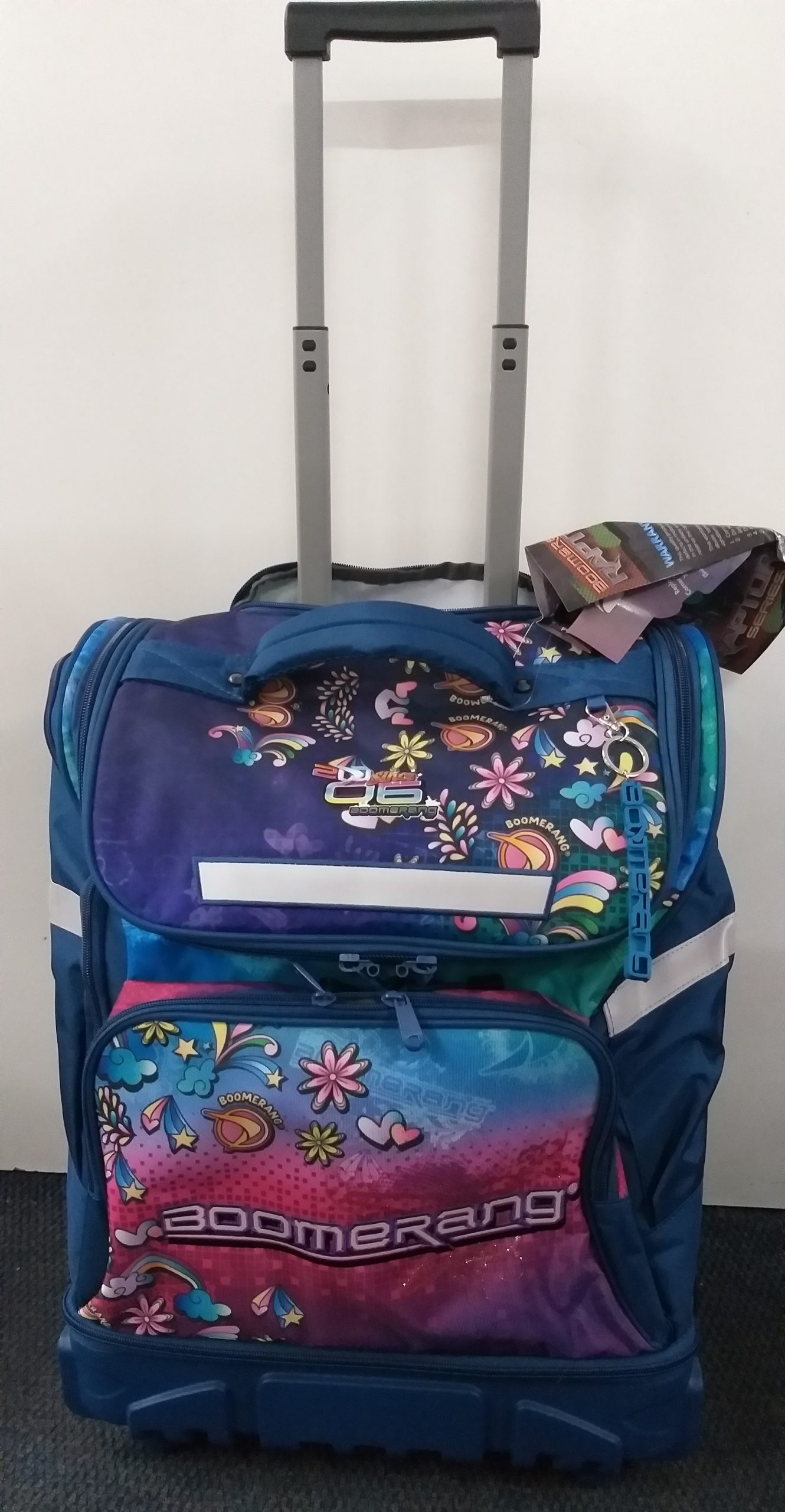 Boomerang Big Wheel Hard Base Jade print XL Dimensions : 38 x 23 x 58cm Big Wheels and a solid bottom With back straps Quality Zippers and Toggles 4 Fabric side pockets