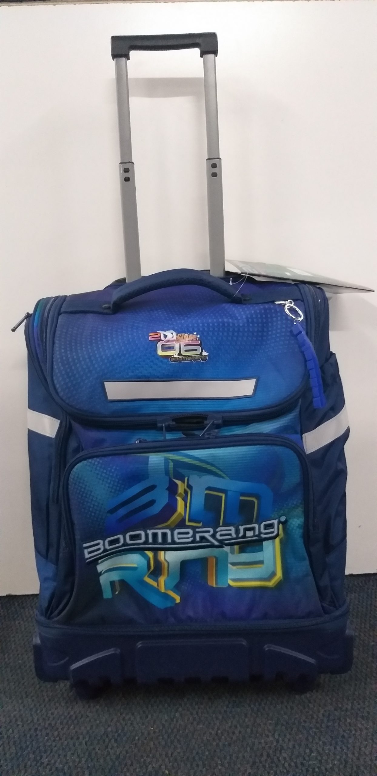 Boomerang Big Wheel Hard Base Navy print XL Dimensions : 38 x 23 x 58cm Big Wheels and a solid bottom With back straps Quality Zippers and Toggles 4 Fabric side pockets