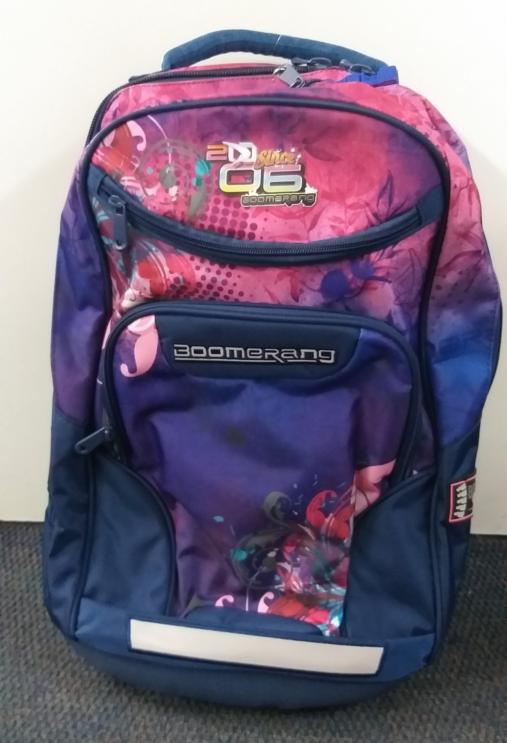 Boomerang Orthopaedic Bag Purple print Dimensions : 34 x 23 x 50 Orthopeadic Support Top Cushioned Handel and thick back and shoulder padding High quality zippers Side Pockets and bag raincoat
